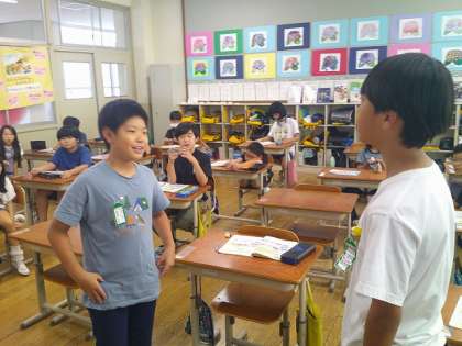 今日の4年生の外国語活動では、ALTのリリアン先生と一緒に「What(time)is it?」「What time is your (Dinner)time?」などの表現を使って、友だちと日課についてコミュニケーションをしました。