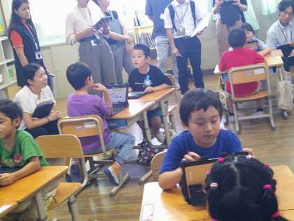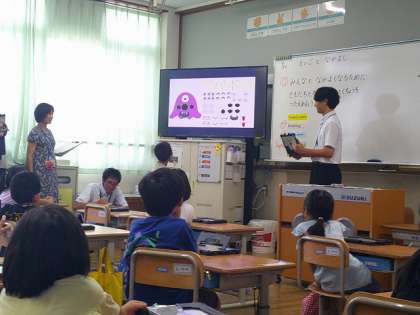 今日の1年生の5時間には、英語活動で『えいごでなかよし』の学習をしました。たくさんの先生が見に来ている中でしたが、とても楽しみながら英語で交流していました。