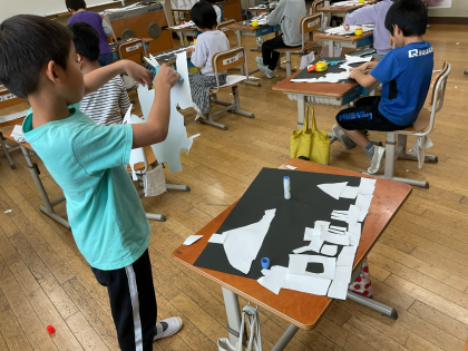 図画工作科で「はさみのあーと」の学習をしました。自由に切った紙を黒い紙の上に並べると、どんな様子に見えてくるのかを楽しみながら作りました。見えてきた形を並び替えながら考え、自分の世界を作り上げることができました。