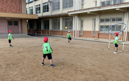 体育科で「パスゲーム」の学習が始まりました。学習の流れを確認して、役割分担をしたり、力を合わせてゴールを運んだりして、準備万端でスタートすることができました。パスゲームは、「投げる」、「受ける」が大事だということに気づき、ゲームの前にそれぞれのチームでパスの練習をしています。声をかけ合いながらパスをしたり、パスやゴールを楽しんだりすることができました。