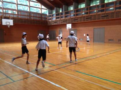 雨は降っていませんが,風が強くて2回目のカッター船が,中止になりました。トビーホールという場所でスポーツ大会を行います。まずは,バスケット4組対抗戦。盛り上がってます。