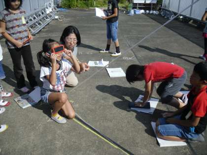 3年生が屋上で太陽の動きを調べていました。位置を遮光板を使って確かめていました。動きはばっちりわかったかな?
