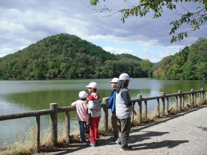 宝ケ池のきれいな風景を見ました。池をのぞきこむと大きなコイがたくさん泳いでいました。ここのポイントではグループ全員で手をつないでそれをほどいていくという「人間ちえのわ」です。なかなかの難関だったようです。次のポイントではボールをグループの子ども達が一列になってまたの下を地面につけないで最後まで通していきます。並び方がポイントのようです。