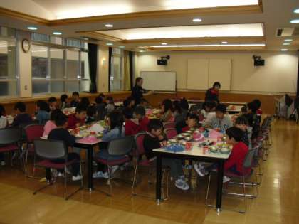 3月10日(月)乾隆幼稚園の年長園児と乾隆小学校1年生との交流給食が行われました。これは,幼少連携教育の一環として行っているものです。1年生児童が年長園児に給食を配り,みんなで「いただきます」をしました。園児の中には,おかわりをする子もおり,みんな「おいしい」と言って食べていました。