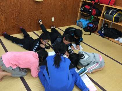 今日1日を振り返ってしおりに記入していました。その後,全体で就寝についての打ち合わせを行いました。荷物整理をきちんとして寝る用意です。