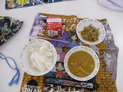 今日の栄養指導は2年生です。野菜を使った給食や季節に応じてさまざまな野菜が使われていることを学習しました。そのあとは栄養指導の時だけ使う食器でみんなで楽しく食べました。今日の給食はカレーです。