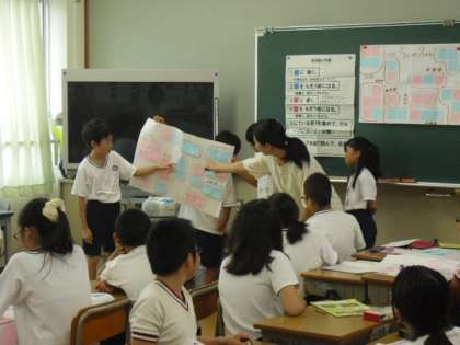 今日の3、4時間目、5年生を対象に「こどもエコライフチャレンジ」の授業がワークショップ形式で行われました。夏休み前に決めたエコライフの取組をグループで振り返り、できた取組を青の付箋、できなかった取組を赤の付箋に書き、1枚の模造紙にまとめていきました。その結果をグループごとに発表し、今後のエコ目標を決めていきました。