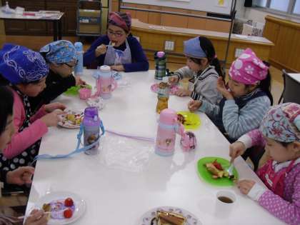 図書ボランティアさんを中心に行われました。まず「グリとグラ」の絵本の読み聞かせがあったあと,その絵本に登場していたカステラ作りを行いました。みんな熱心にカステラ作りをしていました。そしてランチルームで自分達の作ったカステラをみんなで食べました。いちごやチョコレートのトッピングでおいしそうに食べていました。楽しいひとときをすごせましたね。お世話になったスタッフの方々,ありがとうございました。