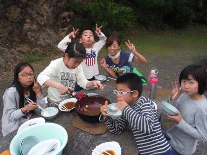 今日の夕食は、すき焼き風煮です。野外炊事でみんなで協力して作りました。(野外炊事の奮戦記は後ほどアップします)とてもおいしそうにできたので、最後は空っぽになりました。とてもおいしかったのですが、珍客がお相伴にあずかろうとこっちを見ています。