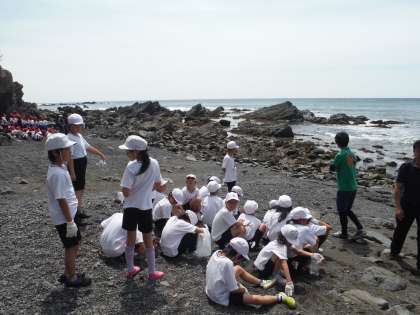磯観察に出発です。「宮崎浜に出られない。」という情報が流れましたが、まだいけることあわかり出発しました。出発前に記念撮影をします。崖を登りきると海が見えます。「海だ!」という声が沸き起こります。なにがみるかるのかな。