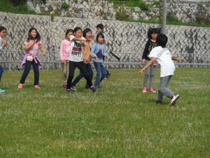 昼食の後は芝生広場で遊びました。担任の長尾先生がフリスビーへの造詣が深いので、まずはフリスビーを使ってドッヂボールをします。最終戦の男子タイ女子は大盛り上がりで、 の勝ちとなりました。