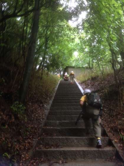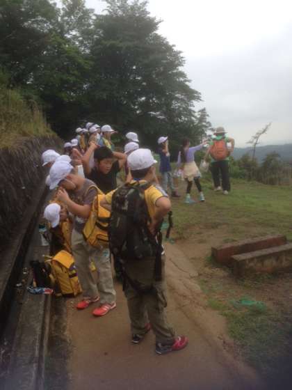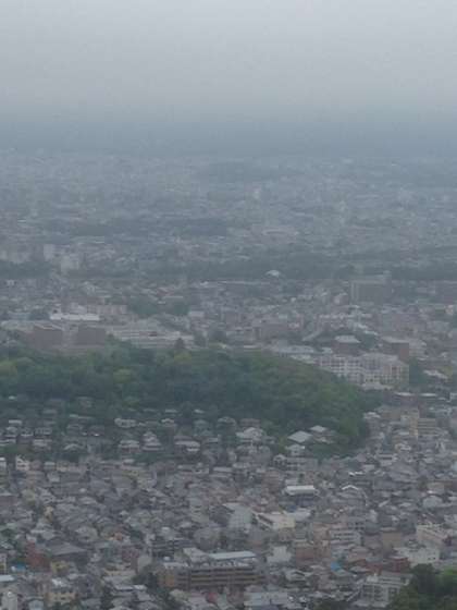順調に歩を進め,大文字山の頂上に着きました。絶好の眺めとはいきませんが,学習している京都市の様子がよく見渡せます。みんなが頂上を離れるまでに,太陽が顔を出せば,鏡を使って学校の屋上から頂上を照らし,学校の場所を伝えたいのですが,晴れるかな?