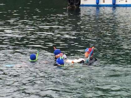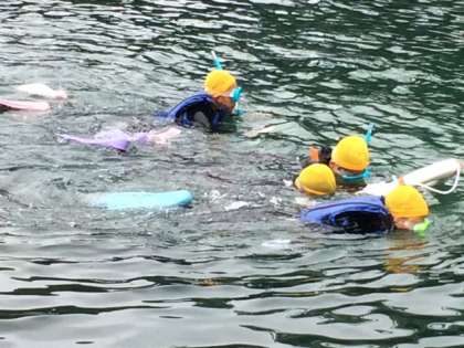 スノーケルフィンもつけ,ちょっとお魚になった気分?初日の水泳とは,また違った海の楽しみ方です。