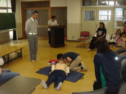 来ていただいて講習会が行われました。まず,映像を使って救命救急の基本や