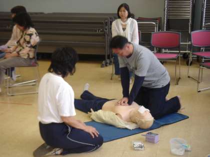 心肺蘇生法のやり方を教えていただきました。その後は,実際に人形を使い