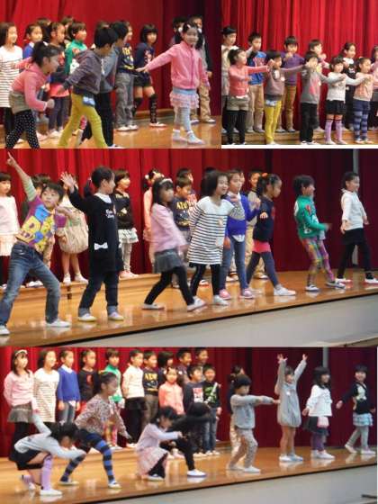 始まった後の舞台裏では「答え声に出さんと、心の中で言ってほしい。」という声が上がっていました。でも、上手にできたからみんなが引き込まれていったのじゃないでしょうか。最後のポーズは個性が出ていますね。「ちょっとはずかしがりやさん」「上手にできたでしょ。」「かっこいいポーズ」いろいろです。