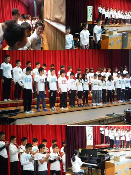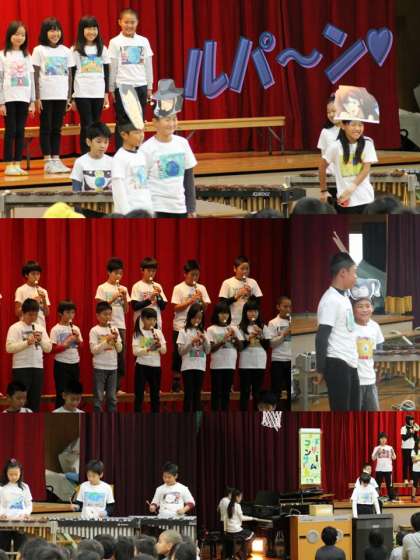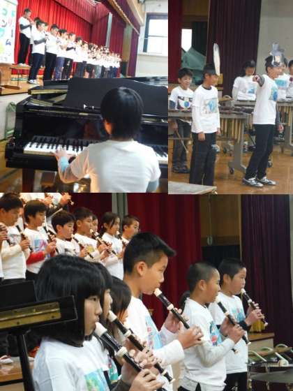 リコーダーを中心としたメロディーが流れ、真剣な表情で演奏が始まりました。いろいろな楽器が登場し、演奏者がどんどん交替していきます。「多くの人が発表をリードする力があるんだ。」と感心させられました。そして、ちょっと雰囲気が変わりました。