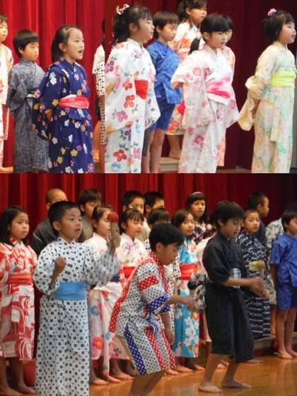 浴衣や甚平等で着飾り、昔の遊びや昔ながらの歌を発表しました。「お寺の 和尚さんが……」「まりつき」「けんだま」「おじゃみ」どんどん進みます。本番当日までの休み時間には、となりの教室でいっぱい練習をしました。いい発表をしようと、3連休の間も唄の歌詞をしっかり覚えました。終わった後はみんな笑顔でした。