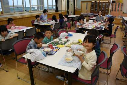 ランチルームで給食を食べたよ