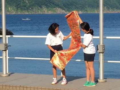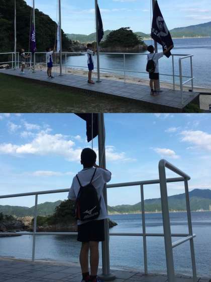 朝は本当に景色がステキです。爽やかな風の中,朝のつどいをしました。学校紹介では,他校に西陣織をアピール。この後は朝ごはん。さてさて お皿は華やかになっていくのでしようか?