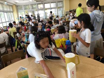 食事のたびに大活躍 食事係とリーダーさん みんなより早くきて場所取り,お茶作りをがんばってます。お茶の用意から最後の片付けまでグループで力をあわせて,毎回の食事を感謝の気持ちでいただいています。