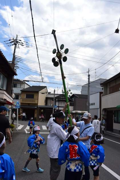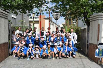 今宮祭の巡行に「こども鉾巡行」として子どもたちが参加させていただきました。乾隆の提灯,太鼓が剣鉾の先導です。子どもがもつ剣鉾は緑色の鉾が2本,赤色の鉾が2本の計4本です。かわるがわる鉾を持ちながら歩きました。かなりの重さがありますが,自分の順番がくるごとに少しずつ上手になりました。沿道の方からも沢山の応援を頂きました。貴重な体験ができました。楽童くらぶの皆様,ありがとうございました。