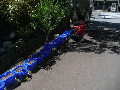 自分の植木鉢に土を入れ,小さな種をまきました。これからペットボトルで毎日水やりをして,花がさくのを楽しみにします。「早く,おおきくなあれ〜」