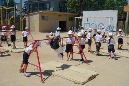 1年生は体育で「てつぼうあそび」をしています。今日は『こうもり』や『ぶたのまるやき』などを学習しました。親指の向きに気を付けながら、しっかり鉄棒を握って足を上げました。友達ががんばっている様子をよく見て落ち着いて安全に学習しています。
