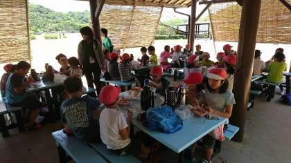 いただきます!待ちに待ったお昼ごはんです。バスの疲れも吹き飛びます。しっかり食べて、午後の活動に備えてほしいと思います。