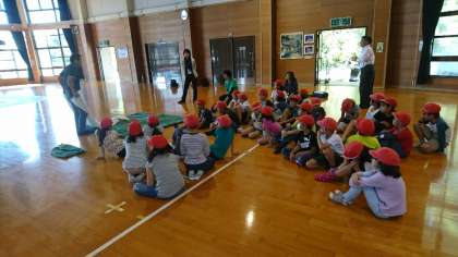 入所式の後、プレイホールでオリエンテーションがありました。職員の方にお風呂の入り方やトイレの使い方、寝袋の使い方などを教えていただきました。「何事も友達と協力して行いましょう。」と教わりました。