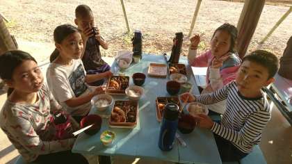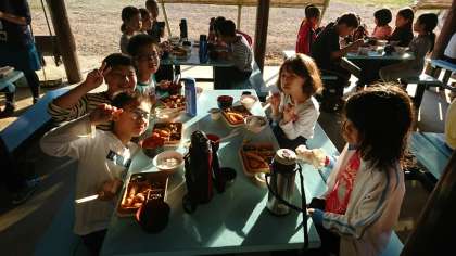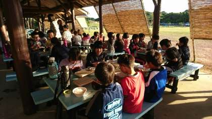 夕食の時間です。浦山ラリーでお腹はペコペコなので、一段とおいしく感じます。友達とおしゃべりしながらの夕食は格別です。よく食べて、キャンプファイアーに備えましょう。
