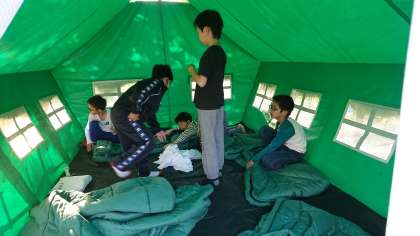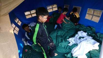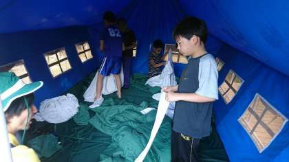 夕べはみんな早めに就寝し、朝6時にはしっかり起きられました。男子は自主的に寝袋をたたみ、朝の集いに備えられました。今日は、女子がテントに泊まります。