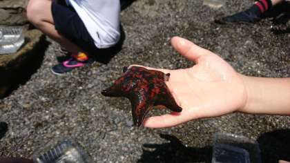 磯観察の最後には、マリンランドの職員の方から、ヒトデを一匹ずつ配っていただき、観察をしました。そっと触れたり裏返したり、手に乗せたりしてみました。裏返して置いておくと、自力で表向きに戻る様子も観察しました。ヒトデの不思議な体の作りについても教えていただきました。