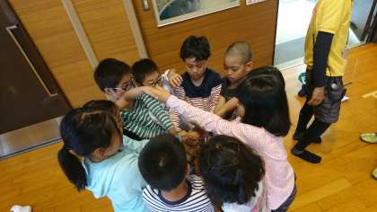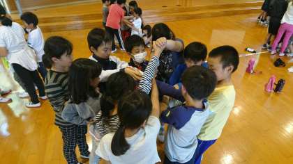 伝言ゲーム、ジェスチャーゲーム、人間知恵の輪など、工夫を凝らした遊びを通して、3校の子どもたちが親睦を深めました。中学校へ進学したら一緒になる仲間です。みさきの家での思い出と共に、築いた絆も大切にしてほしいと思います。
