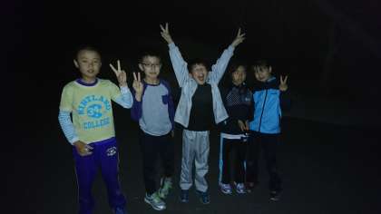 楽しそうに出発したものの、やはり懐中電灯ひとつでは怖かったのか、山の中から大きな声で乾隆小学校の校歌を歌う歌声が聞こえてきました。