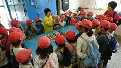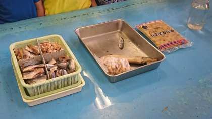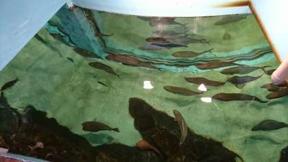 魚たちへのエサやり体験をさせてもらいました。まずは魚によって違うエサの説明をしてもらいました。その後水槽へ。水槽にはサメやタイ、ハマチなど、大型の魚がたくさんいました。