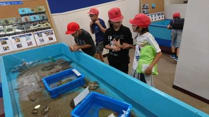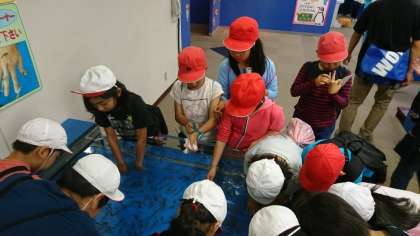 マリンランドの見学再開です。子どもたちが真っ先に向かったのは、魚を触れる体験コーナー。手を洗って水槽の中に手を入れ、なかなか触る機会のない海の生き物たちに触れていました。