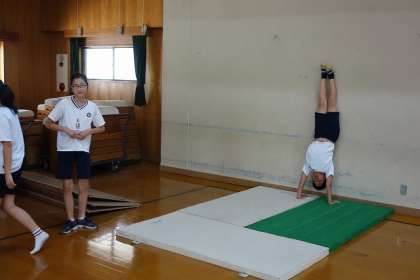 6年生の体育では、マット運動の学習をしています。今日は一つ一つ丁寧に技をきめるために、個別の練習をしました。自分に合った場を選び、失敗しても何度も何度も挑戦することができました。