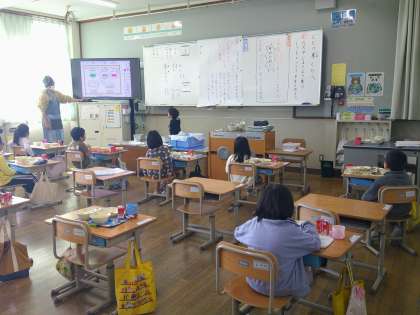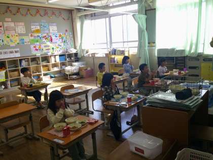給食の時間に1年生の教室をのぞくと、せっせと給食の準備をする姿が。みんなで協力しながら準備する姿がとってもよかったです!さっと準備をして、みんなでそろっておいしく食べました!