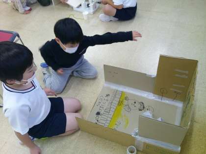 ゲームのルールを伝えたり、一緒にゲームを楽しんだりしながら、年長さん達とたくさんお話ができました。年長さん達が喜んでくれて、1年生もうれしそうでした。