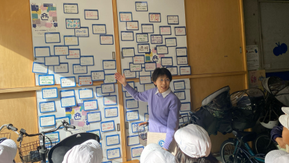 西陣児童館は、来年の1月に建て替えが始まるそうです。「西陣の地域や西陣児童館が、こんなふうになってほしい。」という思いを利用している人たちに書いてもらったそうです。たくさんの紙が貼り出されていました。未来の西陣はええとこや!という思いがつまったボードになっていました。