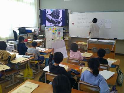 2年生は初めての紙版画に挑戦していました。画用紙で作ったパーツを組み合わせ、自分の作品のイメージを確認します。足は広げるか、腕はどのくらいあげることにするかなど、組み合わせ方で出来上がりが違うことに気づき、自分の作品をどうするか一生懸命に考えていました。
