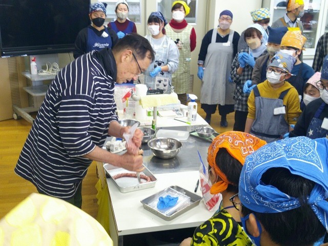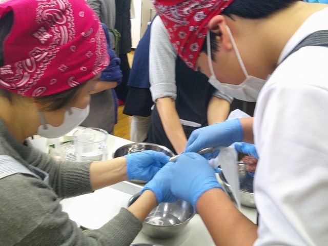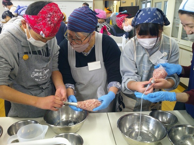 しっかりこねられたら、羊の腸の皮にお肉を絞り出します。これがソーセージ作りの醍醐味かもしれません。協力して皮を口金にセットし、こねたお肉を絞り出していきます。腸をセットするのが難しく、協力しながら頑張りました。最初は緊張している様子でしたが、コツをつかむと上手にできるようになっていきました。
