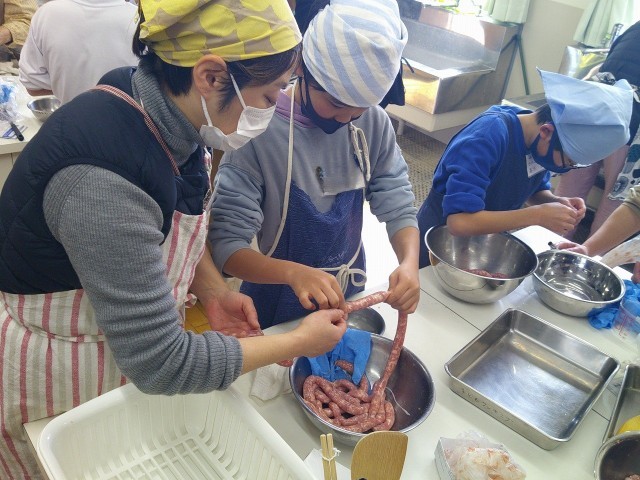 腸に詰められた長ーいソーセージを、好みの長さでねじっていきます。これもソーセージ作りの醍醐味です。これも腸が破れそうで緊張しましたが、だんだん慣れていきます。何でもやってみることでコツがわかっていきます。
