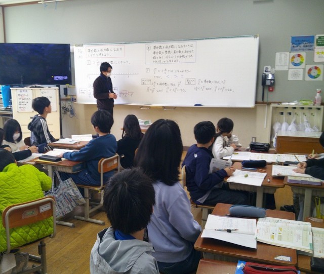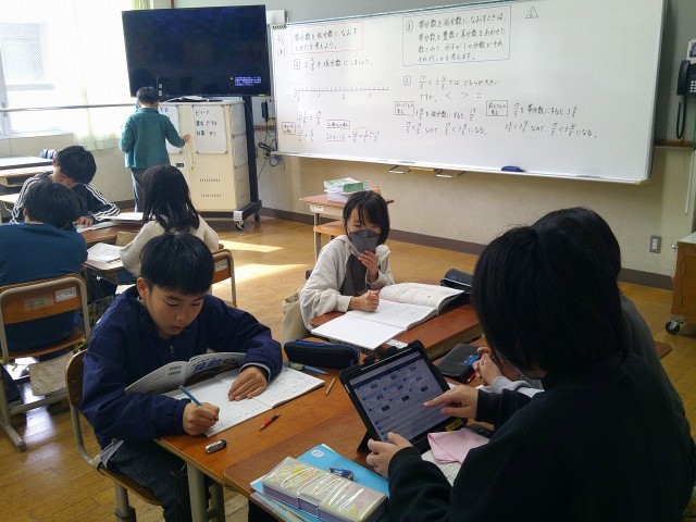 4年生は分数の学習をしています。帯分数を仮分数に直したり、帯分数と仮分数の大きさを比べたりしています。友達と考え方を相談し合って、問題に挑戦していました。早く問題ができた子は、タブレットで練習問題に取り組んでいました。