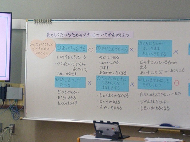 1年生は3時間目に食の学習をしました。みんなで食べる時のマナーについて考えました。幼稚園との交流給食でも生かせるかな。