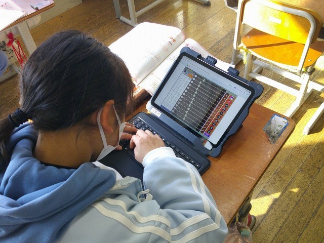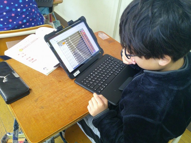 4年生は音楽の時間にタブレットを使って、琴の作曲をしていました。プログラミングのソフトで簡単に音を調整できるので、自分が作りたい音楽になるまで何度でも試せます。本物の琴にふれるのはなかなか難しいですが、こんな形で琴の音楽に触れられるのだなと思いました。