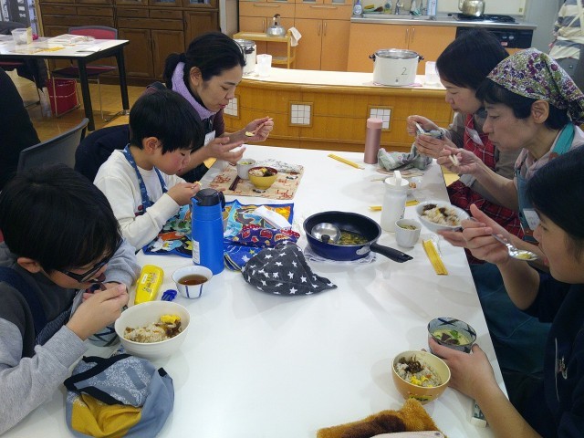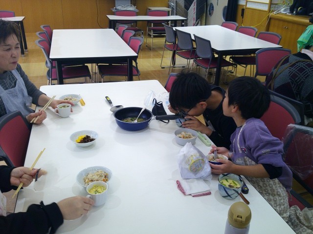 完成した「いり大豆ごはん」と「ネオ茶碗蒸し」をみんなでおいしくいただきました。ネオ茶碗蒸しはホタテあんをかけずに味わうと、コーンとチーズの風味が完全に洋風ですが、ホタテあんをかけると一気に和風になります。大豆ごはんは、ふっくら炊き上がり、梅が季節を感じさせてくれました。料理は作って味わうだけでなく、季節を感じられたり、コミュニケーションを生んだりと、本当に様々な学びがあります。