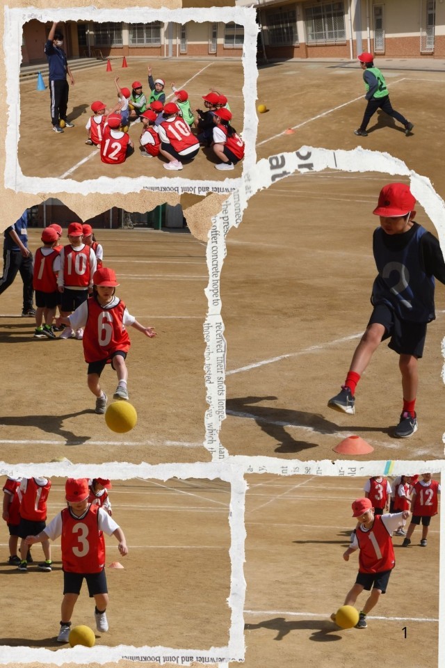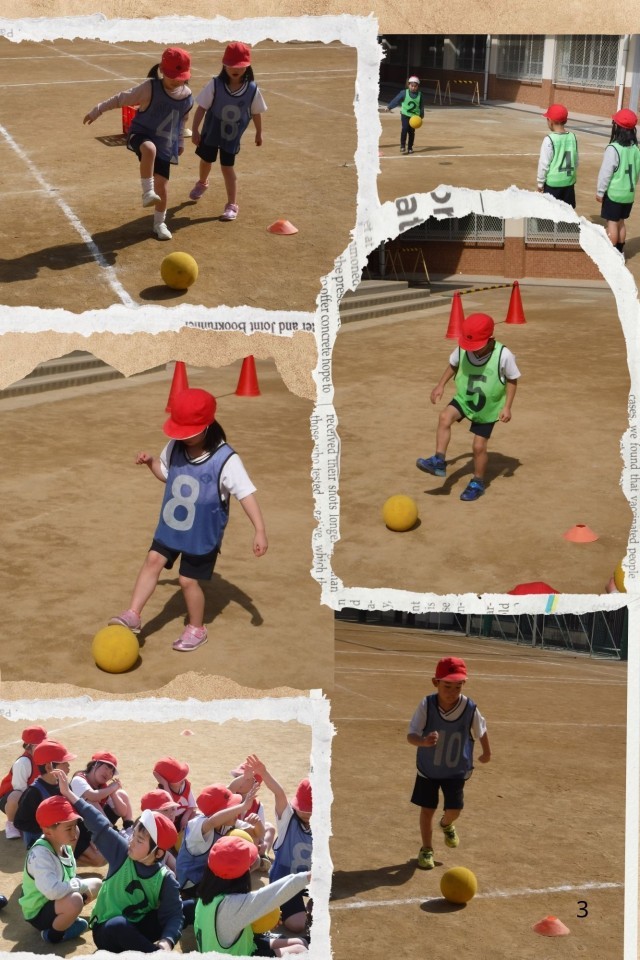 寒さが和らぎ,運動場での体育が気もちいい気候です。今日初めてサッカーの授業をしました。
