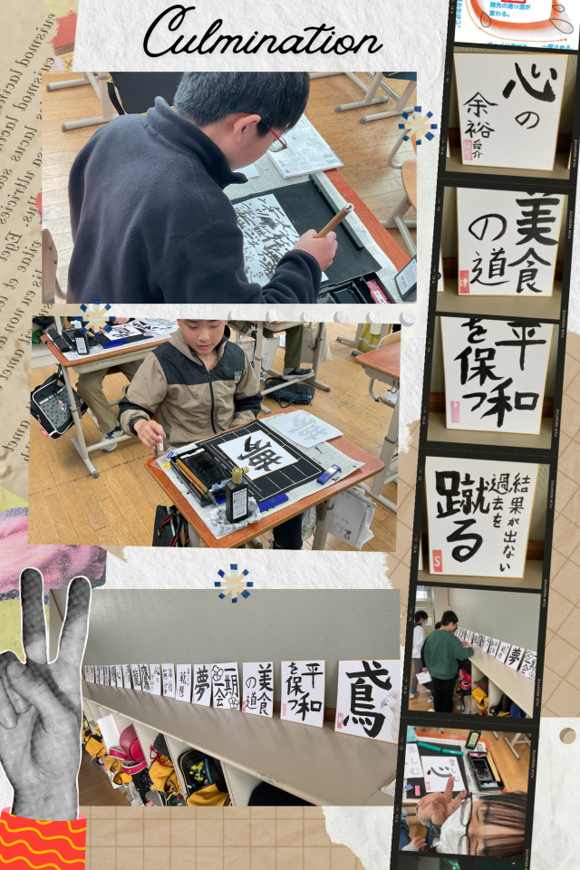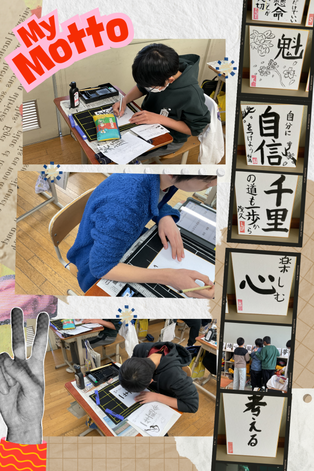 6年生の卒業が近づき、残りの授業が少なくなってきました。今日は、書写の学習の最終回です。各自が大切にしている「文字」「言葉」を色紙に書きます。やり直しがきかないので、緊張しながら書いていきます。書写の学習の集大成です。それぞれの個性が現れた色紙が出来上がりました。